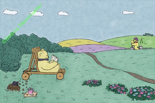 Tina takes a rest to read her favorite book, just as David comes riding the rolling hills on his scooter.